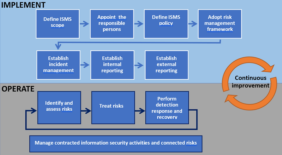 Part-IS splits the implementation into two distinct phases; Implementation and Operation. Whilst the operational phase is a continuous process identifying risks and managing them. The guidance material includes the diagram below.