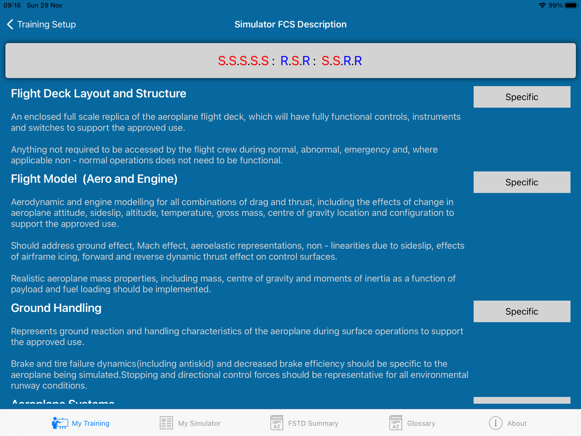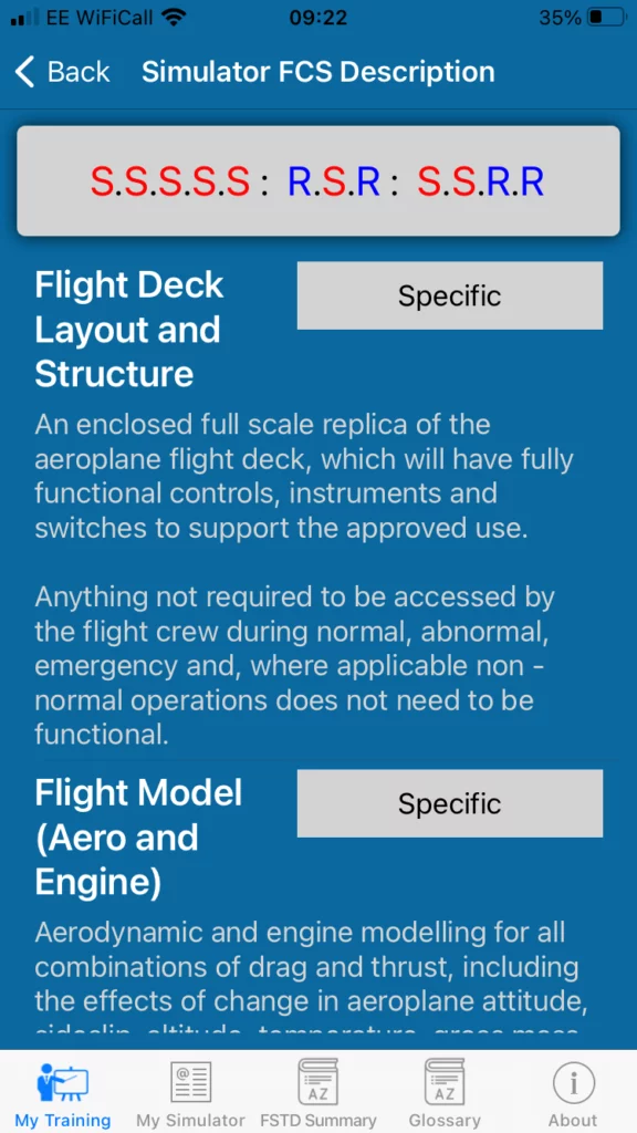 Using the mobile App it is possible to firstly select the training tasks you want your new simulator to be able to be potentially accredited for and the app will detail the applicable FSTD features and the required fidelity levels as per ICAO 9625 4th edition that make up what we now refer to as the FSTD Capability Signature (FCS).